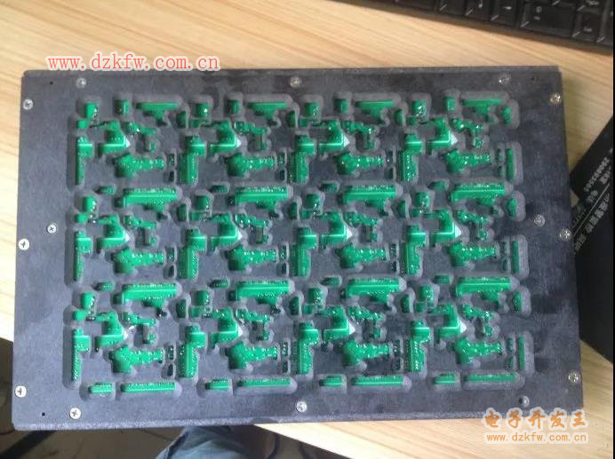 图片中就是所谓的治具,通过一块特殊的挡板,把贴片元器件挡住,只让直插件的引脚露出,然后进行波峰焊接。但是前提条件是贴片元器件和直插件的距离足够的远,而且这块治具的成本并不低。
