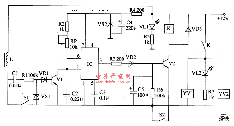 该汽车电子节油器电路由晶体管Vl、V2、集成电路IC、继电器K、电磁阀YVl、YV2和有关外围元器件组成,如图所示。
