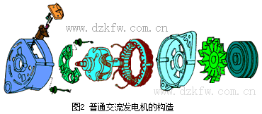 普通交流发电机由后端盖、电刷架、电刷、电刷弹簧压盖、硅二极管、散热板、转子、定子总成、前端盖、风扇和皮带轮等组成。