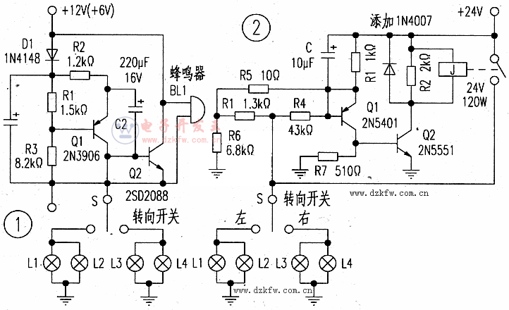 这两款闪光器的Q2都易损坏,建议用TIP41C(100V,6A、65w)等中功率管代换。图2中的继电器也容易损坏(一般是触点烧蚀,打磨后还可使用)。为了保护Q2不被继电器线圈的感应电动势击穿,可以按图中所示加一只二极管。