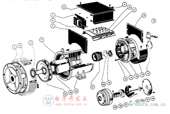 汽车用交流发电机主要由转子、定子、整流器及前后端盖等组成。如图2-1所示。