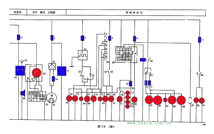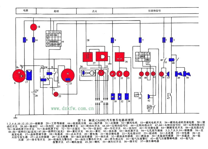 解放CAl092汽车整车电气系统电路原理根据绘制原则分为四大系统,即电源、起动、点火系统电路;仪表、收放机及警报信号系统电路;刮水器、暖风、点烟器系统电路;照明和信号系统电路。如图7—8所示。