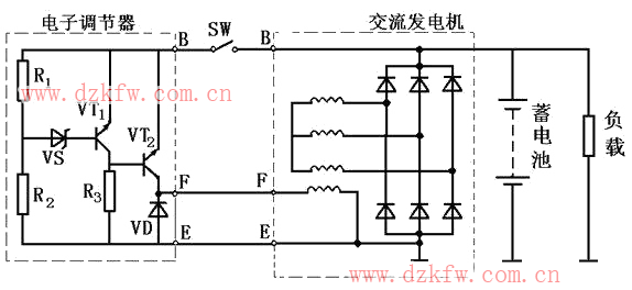内搭铁型电子调节器基本电路的特点是晶体管VT1、VT2采用PNP型,发电机的励磁绕组连接在VT2的集电极和搭铁端之间,与外搭铁型电路显著不同,电路工作原理和结构与外搭铁型电子调节器类似。