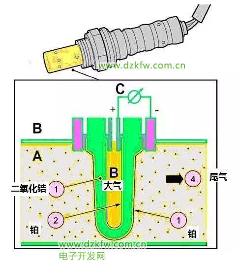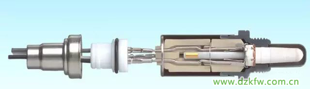 导人排插入排气管中,它的内表面与空气相通,外表面与废气相通。锆管的内、外表面覆盖一层多孔性铂膜作电极,为防止废气腐蚀铂膜,在锆管外表面的铂膜层上覆盖一层多孔陶瓷层,并有一个防护套管,套管上开有槽口或孔。