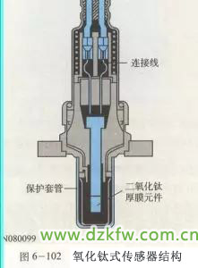 氧化钛式氧传感器对比氧化锆式氧传感器的工作原理有很大的不同,它是利用多孔状导体TiO2的导电性随排气中氧含量的变化而变化的特性制成的,故又称电阻性氧传感器。