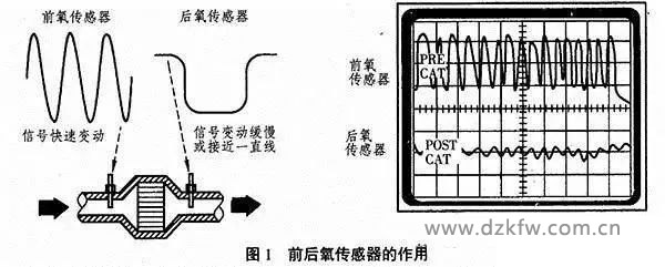 氧传感器是实现这一闭环控制必不可少的重要部件,它对发动机排放控制起着不可或缺的作用。现代电喷发动机一般装有前后两只氧传感器,三元催化转化器效率监测,必须使用位于三元催化转化器后方的第二个氧传感器。当三元催化转化器工作正常时,位于三元催化器前方的氧传感器的变动次数应高于后方的氧传感器,监测器比较前/后氧传感器的变动次数来判定三元催化转化器老化与否。