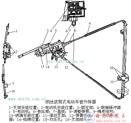 电动车窗主要由车窗升降器、电动机、继电器、开关等组成。其中使用的电动机有永磁电动机和串励电动机,电动机必须双向运转,可以实现车窗的上升和下降运动。如图为钢丝滚筒式电动车窗升降器。