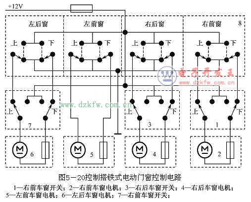 电机的一端直接搭铁,电机内部有两组励磁线圈。通过接通不同的线圈,使电机的转向不同,实现车窗的上升和下降动作,其控制电路见图5-19。