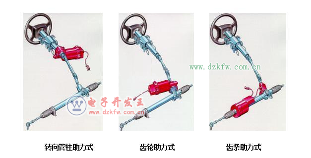 根据助力电机布置位置的不同,电动助力转向分为转向轴助力式、齿轮助力式、齿条助力式。