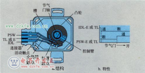 开关触点式节气门位置传感器结构简单,对其检查时只需测量怠速触电和功率触点的通断情况即可判定其好坏;在节气门全闭时怠速触点应闭合,节气门略打开一点即断开。在节气门开度小于50°时,功率触点应断开,节气门开度超过50°时应闭合。
