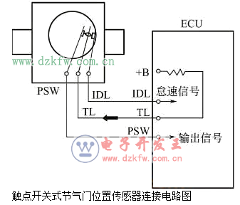 当节气门关闭时,传感器的怠速触点IDL闭合,全开触点PSW断开,怠速触点IDL输出端子输出一个低电平信号“0”,全开触点PSW输出端子输出一个高电平信号“1”。电控单元接收到节气门位置传感器TPS输入的这两个电压信号时,如果车速传感器输入电控单元的信号表示车速为0,那么电控单元便可根据这两个信号判定发动机处于怠速状态,并控制喷油器增加喷油量,保证发动机怠速转速稳定而不致熄火;如果此时车速传感器输入ECU的信号表示车速不为0,那么ECU便可根据这两个信号判定发动机处于减速状态,从而控制喷油器停止喷油,以减少排放量和提高经济性。