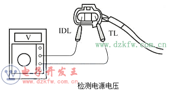 触点开关式节气门位置传感器的电源电压检测如图。检测时应拔下传感器插头,用万用表电压挡测量线束插接器中可动触点(TL端子)的电源电压,应为12V,否则应检查线路是否断路。