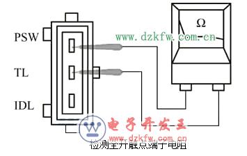 ②检测全开触点端子电阻。拔下传感器接线插头,用万用表的电阻挡测量传感器的全开触点端子(PSW)与可动端子(TL)之间的电阻值,其电阻值应为o,如图2-9所示。转动节气门轴约55°,电阻值应为0Ω。