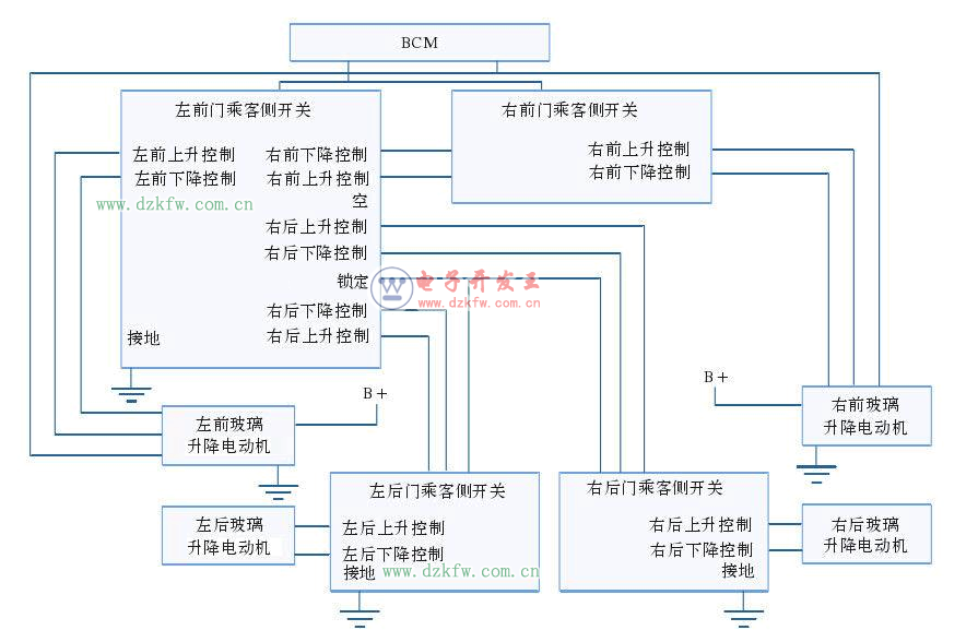 前门具有一键升降带防夹的功能,所以BCM直接控制前门开关和前门电机,来实现一键升降和防夹控制,而后门电动机不具有一键升降带防夹的功能,所以没有和BCM相连。左侧驾驶侧的开关除了可以控制自己的车窗升降,还可以控制其他三个车窗的升降,并可以锁定电动车窗的升降,这样设计便于驾驶员对车辆的整体控制。其他三门的开关都只具有控制自身车窗玻璃升降的功能。