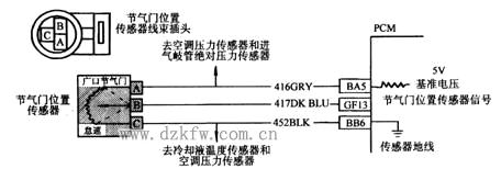 节气门位置传感器与控制单元之间以三根或四根导线连接。当点火开关接通时,控制单元通过其中一根导线向传感器送出一个稳定的5V基准电压信号,另一根导线是传感器到控制单元的信号线,第三根是这两个器件之间的搭铁线。传感器的搭铁线一般为黑线,或者带有彩色条纹的黑线。
