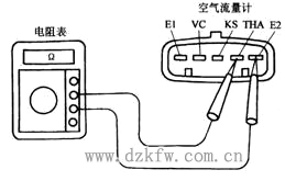 拔下空气流量计插头,用万用表电阻档测量各端子之间的电阻值,应符合表2-5的电阻值。