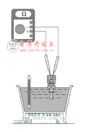 断开(OFF)点火开关,拔下进气温度传感器线束插头,拆下进气温度传感器;用电热吹风器、红外线灯或热水加热进气温度传感器,也可以用制冷剂或压缩空气对进气温度传感器进行降温,并测量在不同温度下传感器两端子之间的电阻。