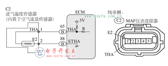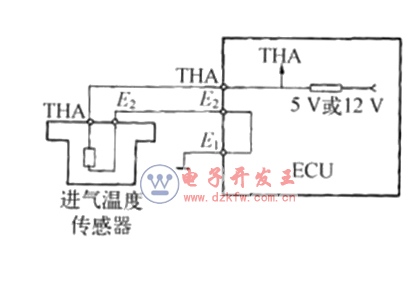 拔下传感器插头,接通点火开关,测量插头上THA端子与E2端子之间的电压应为5V。若无电压,则应检查ECU连接器上THA端子与E2端子间的电压。若此电压为5V,则为ECU与传感器之间线路有故障;若无5V电压,则为ECU故障。