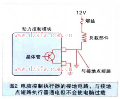 通常,这些指令实际上只是简单地接通或关闭执行器在大多数情况下,由点火开关直接为这些执行 器提供电压,或者通过继电器提供电脑对执行器的控制是通过其内部的一个固态开关(包括功率晶体管和四路驱动器两种)使执行器电路接地完成的虽然在大多数执行器的电路中,电脑控制的是执行器的接地端,但也有电脑控制执行器的电源端的如果连接执行器和电脑之间电路的导线与发动机 缸体或汽车底盘接地点短接,而电脑又在为执行器供电,这种短路可能会损坏电脑(图1)。