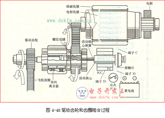 如图4-49所示,吸引线圈和保持线圈的电磁力吸引活动铁心左移,推动驱动齿轮轴,迫使驱动齿轮与飞轮啮合,这种动作过程称为直动齿轮式。