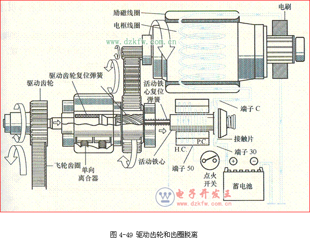 如图4-52所示,为了防止起动机中过大的扭力对齿轮造成损坏,弹簧垫圈把离合器片压紧在内齿轮上,当内齿圈受到过大的扭力时,离合器片和弹簧垫圈可以吸收过大的扭力。