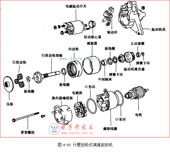 平行轴式减速起动机的分解过程参考图4-53,行星齿轮式减速起动机的分解过程参考图4-50。
