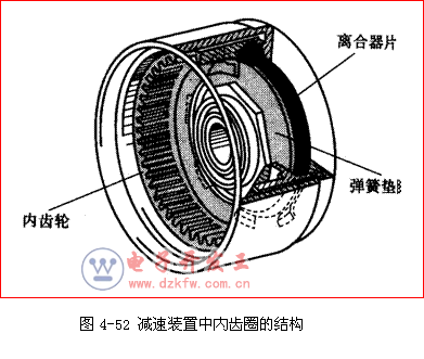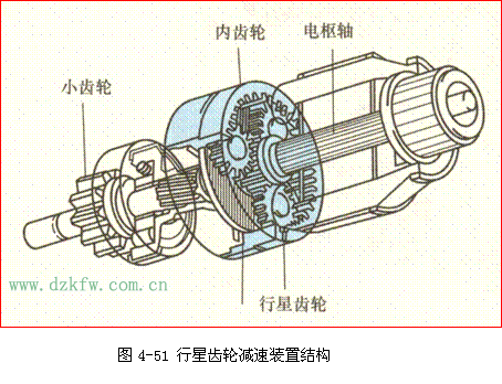 行星齿轮减速装置中设有三个行星轮,一个太阳轮(电枢轴齿轮)及一个固定的内齿圈,其结构如图4-51所示。