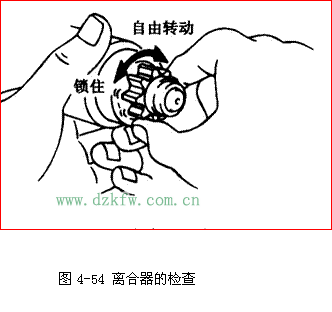 ③ 检查离合器,方法如图4-54所示。顺时针转动驱动齿轮,应能自由转动;逆时针转动驱动齿轮,应能锁住。
