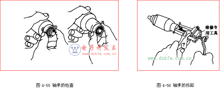 ④ 检查轴承,用手转动每个轴承,同时向内推,如图4-55所示。若感到阻力很大或轴承卡住,则需要更换,更换方法如图4-56所示。注意:要用专用工具和压具进行安装。