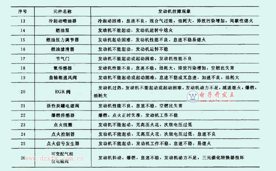 11、喷油器:发动机起动困难,发动机工作不稳,易熄火,息速不稳