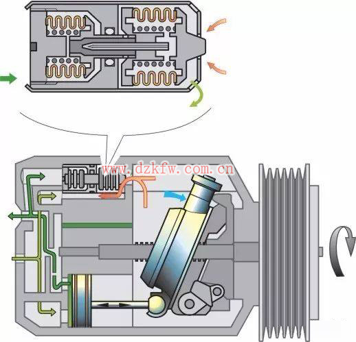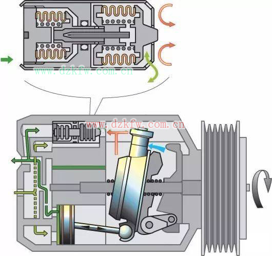 斜盘式轴向柱塞压缩机为目前常用的压缩机。驱动轴的旋转运动由斜盘转换成轴向运动(等于活塞的升程)。根据结构形式的不同可以使用3~10个活塞,这些活塞以驱动轴为中心布置在其周围,每个活塞配备一个吸/压阀。驱动轴的旋转运动被传到驱动毂,经斜盘转换成活塞的轴向运动。斜盘可在导轨内纵向滑动。斜盘的倾斜状态是可变的,于是活塞的行程也就可变,那么输出功率(制冷能力)也就可变。