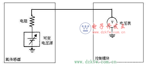 氧传感器电路包括控制模块、氧传感器、连接器和引线。传感器由串联在一起的可变电压源和电阻构成。电压源向控制模块产生零至某电压之间的模拟电压信号。电阻的作用是在传感器与控制模块间发生对地短路时,防止传感器过载。