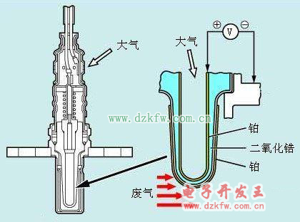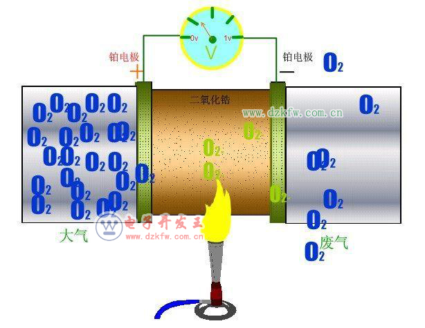 氧传感器的工作是通过将传感陶瓷管内外的氧离子浓度差转化成电压信号输出来实现的,当传感陶瓷管的温度达到350℃时,即具有固态电解质的特性。由于其材质的特殊,使得氧离子可以自由地通过陶瓷管。正是利用这一特性,将浓度差转化成电势差,从而形成电信号输出。