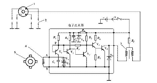 当信号发生器输出的电压为A负B正时,VT1导通,P点为低电位,VT2截止→VT3导通→VT4截止→VT5截止,切断初级电路,在次级产生高压,点火。