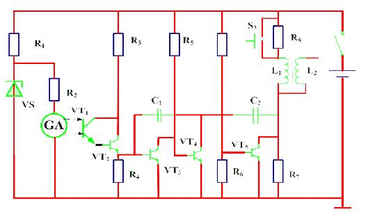 当信号发生器输出的电压为A正B负时,VT1截止,但P点仍保持高电位,VT2导通→VT3截止→VT4导通→VT5导通,初级电路接通的。