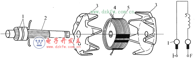 1—滑环; 2—转子轴; 3—磁爪; 4—磁轭; 5—磁场绕组
