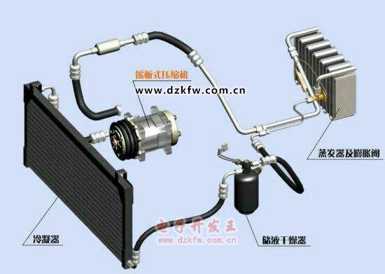 汽车空调制冷系统主要是由压缩机、膨胀阀、冷凝器、蒸发器和鼓风机等组成,其间各个部件之间采用高压橡胶管和钢管连接成一个密闭的系统,在制冷系统工作时,制冷剂会以不同的状态在这个空间里循环流动,而这样的循环又分为了四个过程: