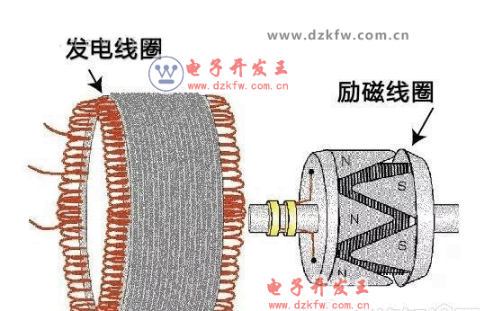 那怎么调节发电量呢?答案是调节发电机磁场强度。初中物理基本都讲过了,发电机是靠线圈切割磁感线发电的,切割速度(转速)越快、磁场强度越大电压就越高。转速我们是没办法调节了,那只能调节磁场强度了。