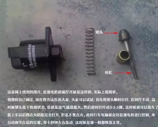 然后将怠速电机装车,将钥匙完全打开,也就是拧到ON的位置,这时候行车电脑会自动对怠速电机进行调解。大概十秒钟就可以启动车辆了。如果怠速正常,则说明调节到位。如果怠速偏高,说明进气量大了,需要拆下来逆时针再转动0.5-1圈。然后再重复以上动作。如果怠速太低或者无法启动,那就说明进气不足,这时候就需要将堵头顺时针拧0.5-1圈。