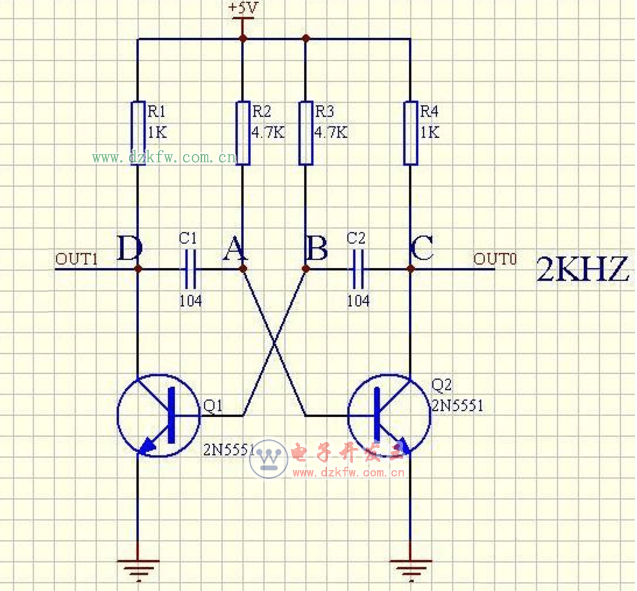 Q1饱和后相当于一个接通的开关,电容C1通过他放电。C2通过它充电。随着C1的放电,由于有正电源VCC的作用,Q2的基极电压逐渐升高,当A点电压达到0.7V后,Q2开始导通进入放大区,电路中又会立刻出现连锁反应,是Q2迅速饱和,Q1截止,C点电位变电平“0”。D点电位变高电平“1”。这个时候电容C2放电,C1充电。这一充放电过程又会使Q1重新饱和,Q2截止。如此周而复始,形成振荡。