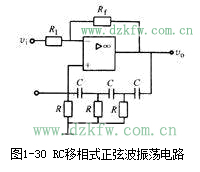 RC移相式正弦波振荡电路是把RC移相网络作为正弦波振荡电路的反馈环节,如图l-30所示。该振荡电路的RC移相网络提供180°解的相移, 而放大器采用反相输入比例放大电路,故φa=-180。,φa+φf=0°满足振荡的相位条件,只要调节热敏电阻Rf,使放大倍数足以补偿反馈网络引起的 信号幅度衰减,就可以产生正弦波振荡信号。