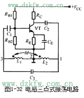 电感三点式振荡器的典型电路如图1-32所示。在LC振荡回路中,电感有一个抽头使线圈分成两部分即线圈L1和线圈L2,线圈L1的3端接到晶 体管的基极B,线圈L2的1端接晶体管的集电极C,中间抽头2接发射极E。也就是说电感线圈的三端分别接晶体管的三极,所以叫电感三点式振荡器,又称哈特 莱振荡器。
