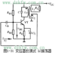 反馈网络采用变压器,利用变压器的一次绕组与电容并联组成振荡回路作选频网络,代替晶体管集电极电阻Rc,从变压器的二次绕组引回反馈电压并将其加到放大电路的输入端,电路如图1-31所示。