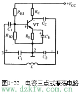图1-33是电容三点式振荡器的典型电路图。其结构与电感三点式振荡器相似,只是将L、C互换了位置。LC振荡回路中采用两个电容串联成电容支路,两 电容中间有一引出端,通过引出端从LC振荡回路的电容支路上取一部分电压反馈到放大电路的输入端,由于电容支路三个端点分别接于晶体管的三极上,所以把这 种电路称为电容三点式LC振荡器,又称为柯尔皮兹振荡器。