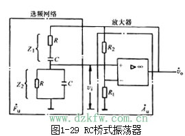 采用RC元件组成的电路作选频网络的正弦波振荡电路,称为RC振荡器。按反馈网络的结构特点,RC振荡电路可分为RC移相式、RC桥式和双T式选频网络的振荡电路。其中RC桥式振荡电路采用RC串并联电路作选频网络,故又称RC串并联振荡电路,如图1-29所示。