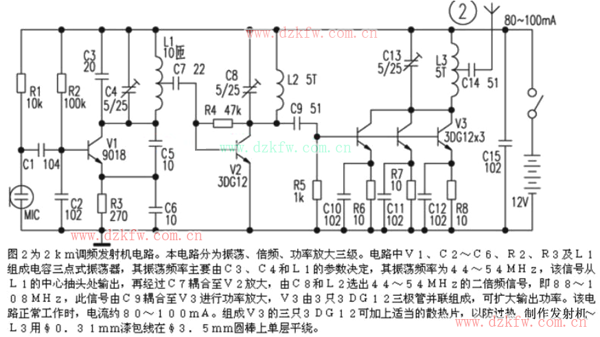 调频发射机电路图,图二为2KM调频发射机电路。本电路分为振荡,倍频,功率放大三级。电路中V1,C2-C6,R2,R3及L1组成电容三点式振荡器,其振荡频率主要同C3,C4和L1的参数决定,其振荡频率为44-54MHZ,该信号从L1的中心抽头处输出,再经过C7耦合至V2放大,由C8和L2选出44-54的二倍频信号。