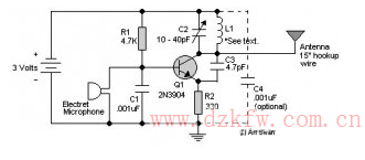 这是一个更容易建立微型发射机,使用最少的部分。建筑是直截了当的和非关键。虽然本设计采用一个3伏电源(如锂硬币或钮扣电池),一个9伏电池可以利用,相反,越来越多的R1和R2转变为1K的价值。C4是一个可选的射频旁路电容器,可以帮助提高性能和提高距离一点。实验发现,最好的结果。
