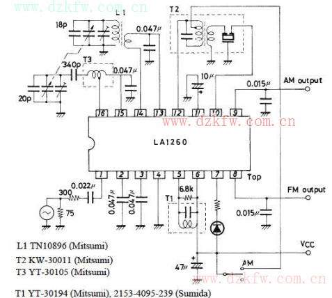 一个非常简单的调频中频/兆瓦无线电接收机电路设计,可以使用LA1260三洋半导体IC设计。LA1260IC可用于AM调频收音机接收器的电子项目,正如你可以在电路原理看到。1260在集成包的许多功能和无线电接收器应用程序所需的功能。LA1260IC一些重要的功能:FMIF放大器,正交检波器,自动对焦前置放大器,调谐指示器驱动器输出。AM:射频放大器,混合,振荡器(ALC),中频放大器,检测器,自动增益控制,调谐指示器驱动器。