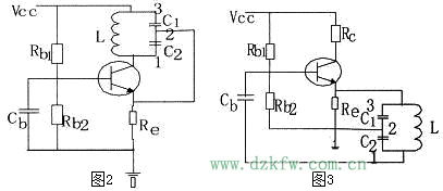 如图2和图3所示,是两个电容三点式的振荡电路。我们应用射同基反判断相位条件是否满足。