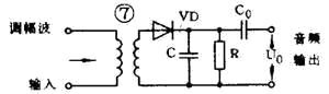 图7是一个二极管检波电路。VD是检波元件,C和R是低通滤波器。当输入的已调波信号较大时,二极管VD是断续工作的。正半周时,二极管导通,对C充电;负半周和输入电压较小时,二极管截止,C对R放电。在R两端得到的电压包含的频率成分很多,经过电容C滤除了高频部分,再经过隔直流电容C0的隔直流作用,在输出端就可得到还原的低频信号。